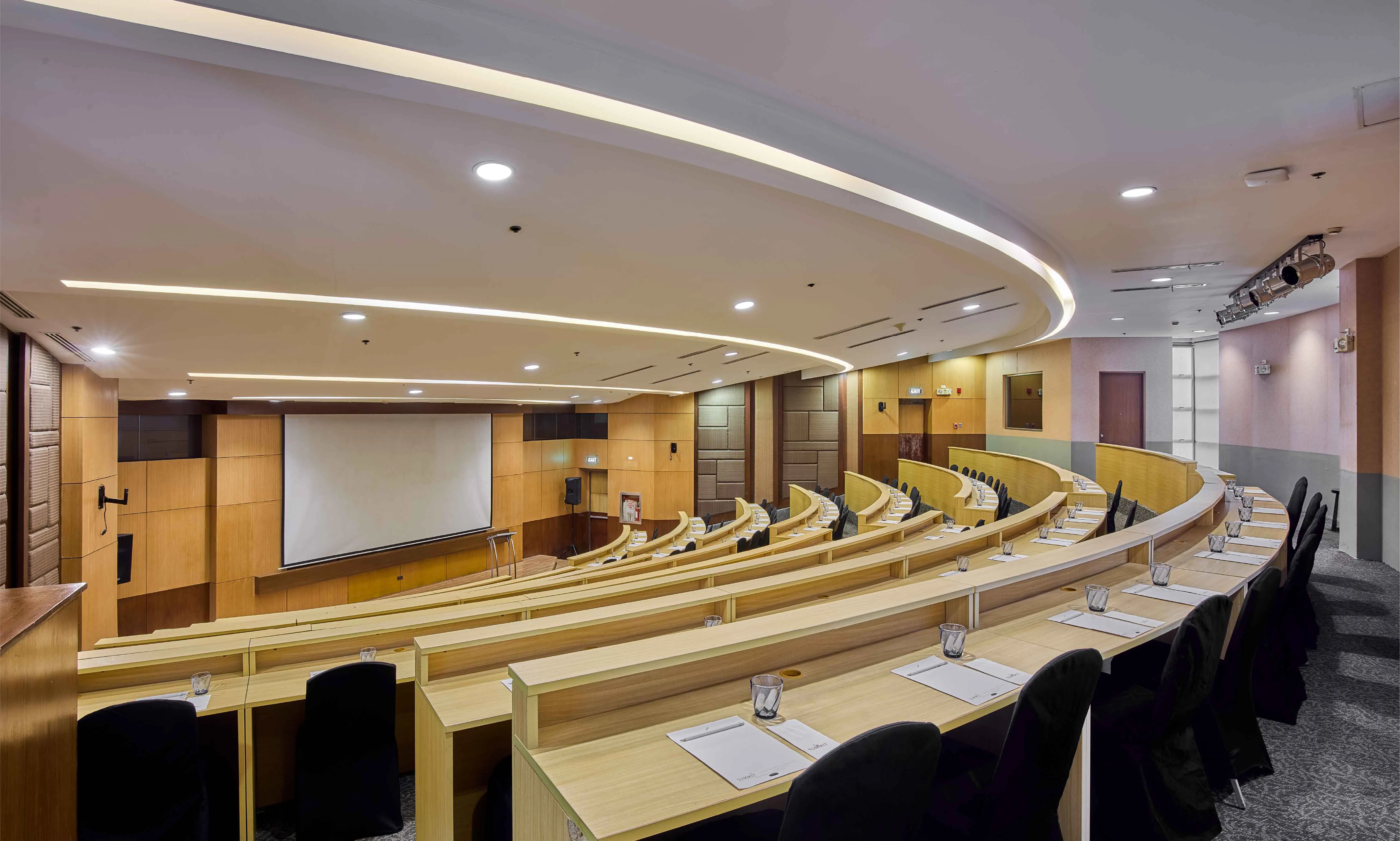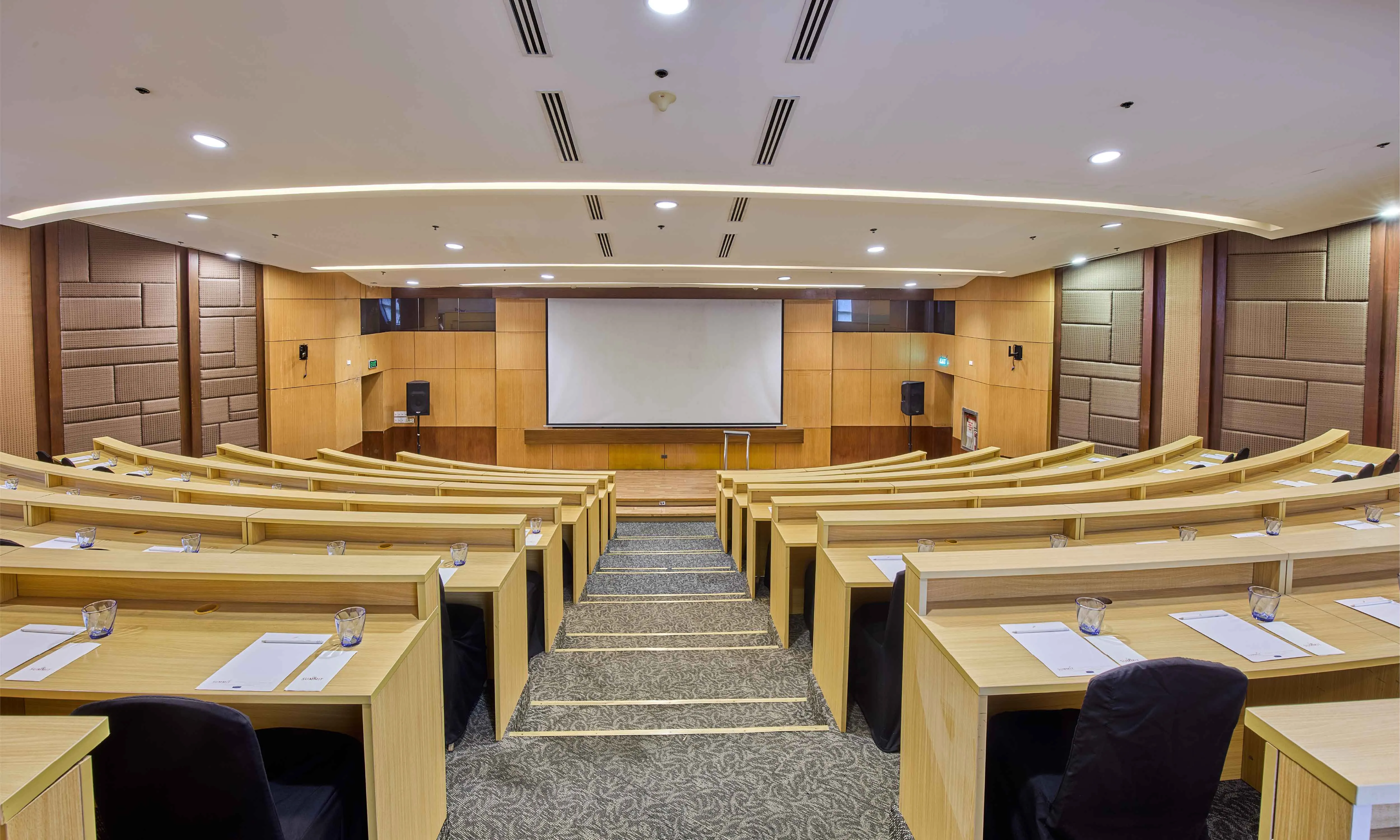The Summit Learning Center is a premier destination for corporate training, featuring an amphitheater design. This specialized layout fosters high engagement and clear sightlines, making it an ideal choice for seminars, workshops, and masterclasses.